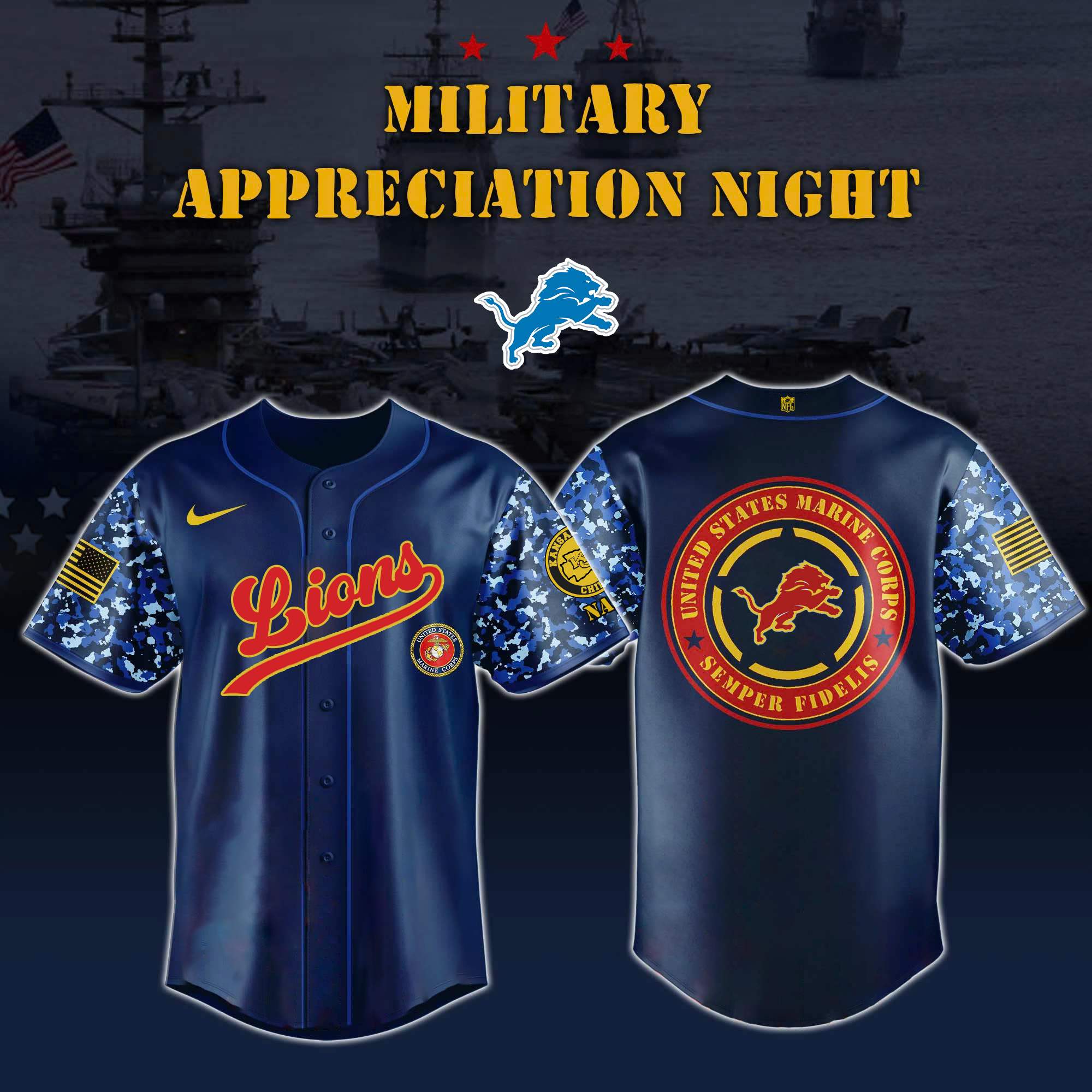 NFL Lions x Marines Corps Military Memorial Day Limited Edition Jersey 2025 Ver 2